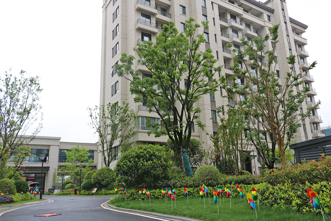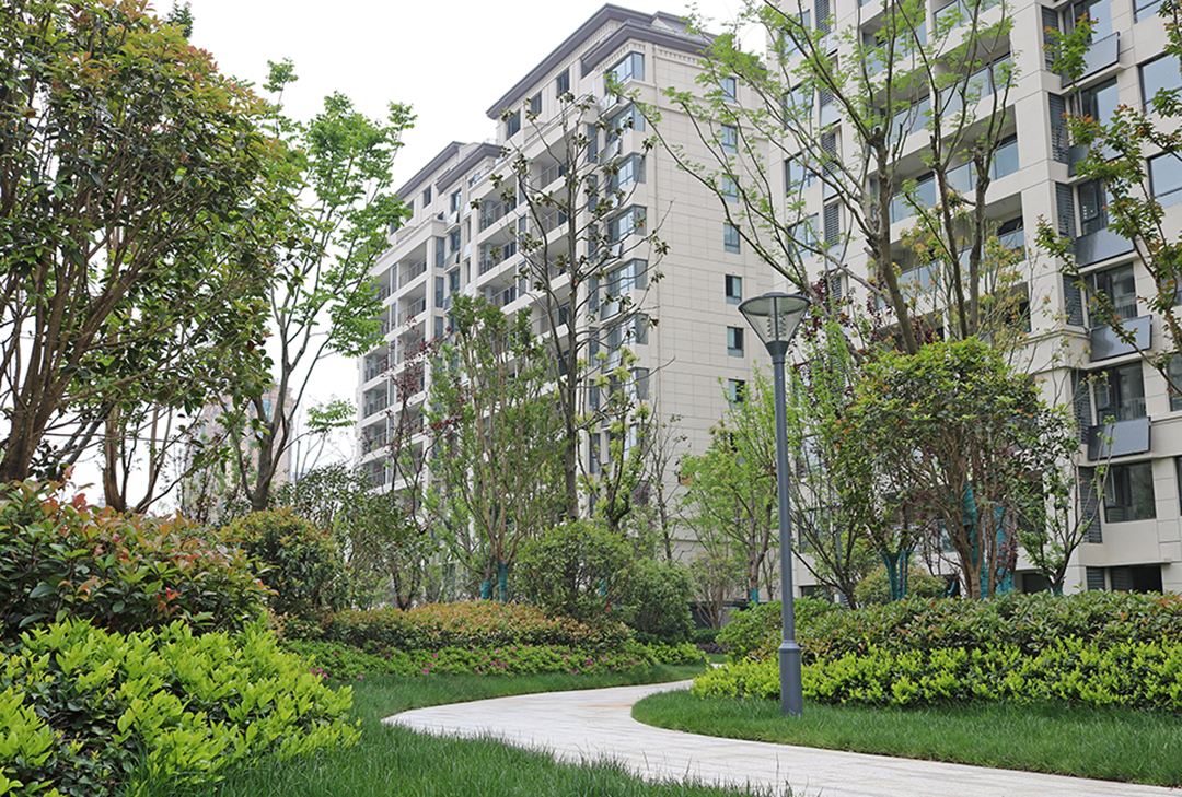 虽然只有七栋洋房交付,但景观一点儿都没含糊。乔木很多、密度很大,而且景观的层次多,颜色多,置身其中,很难相信这是一个刚刚交付的社区。项目约32.55%的绿地率,约60米超大楼间距,两条竖向主景观轴线与中央景观交替,通过各种小品搭配,使景观与业主活动空间相融合,营造出一个既有传统审美意趣,又有现代审美的园林景观。园区内一步一景,步步有景。入口处的景观树对阵式排列,好像仪仗兵列队欢迎您归家,彰显尊贵感,道路两旁种植紫叶李、樱花、海棠、枫树、桂花、朴树、香泡等乔木,搭配色彩淡雅的南天竹、金边黄杨、杜鹃等植物,每一寸美的背后,都纳藏着“不计成本”的匠心。
