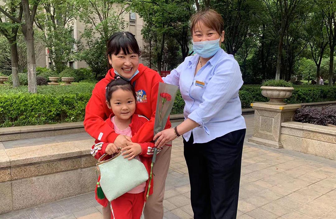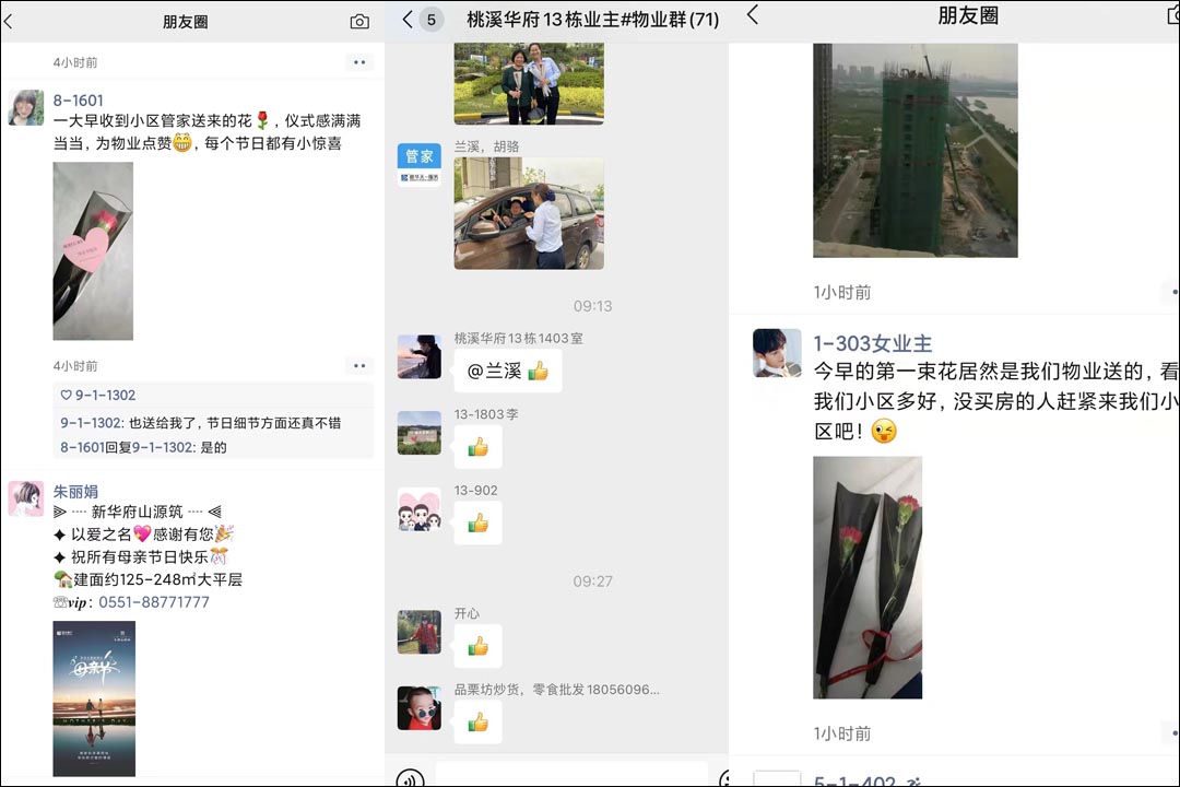 一声声祝福的话语让收到鲜花的妈妈们脸上都洋溢着美丽的笑容,大家纷纷在业主群和朋友圈分享节日的喜悦:“为物业工作人员点赞,谢谢你们为妈妈们创造了这么温馨的时刻!”