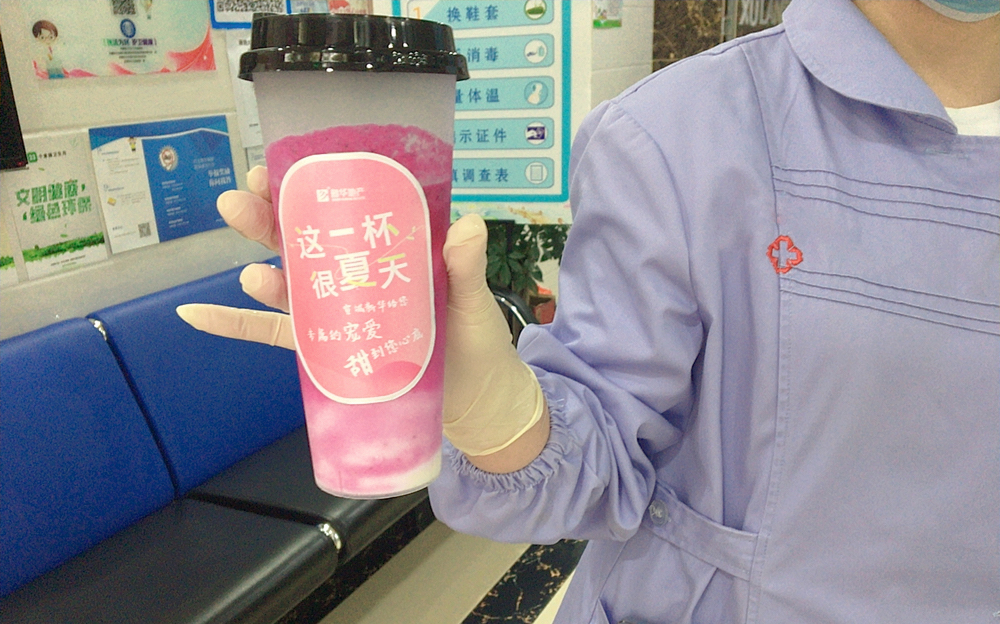 做新华家人,我们来宠你。为感谢医护人的辛勤付出,我们特为在医院辛苦工作的业主朋友们送到一份来自家人的关心,新华天一服务的客服小姐姐精挑细选红心火龙果和品牌冷藏酸奶,为确保口感纯正,仅提前1小时制作,只为把新鲜的、营养的夏日果饮送给医护人,饱含爱心和衷心祝福!